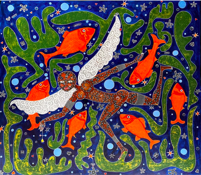 My favorite piece from the exhibition was Oxygen. In Oxygen, the guardian angel appears to be dancing in a body of water surrounded by plants and fishโa reminder that oxygen is life and the choice we have to make in guarding it, in loving our environment to sustain it.
